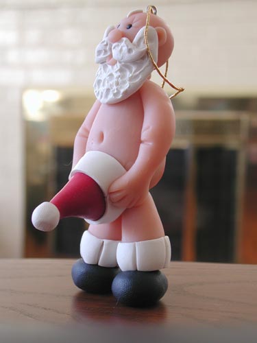 >> Back to Seasonal Tacky >> Christmas Naked SantaHis cheeks are red! This delightfully tacky Santa was purchased at the Takoma Street Festival in October 2004, from the actual artist. She didn't seem pleased when I pointed out that it was a tacky Santa. She feigned politeness and said, "I like to think of it as whimsical." And yet she has also created an all-feline Nativity scene, which doesn't figure in any theology that I know of. Little did she know that she was receiving a high compliment from me, the Tacky Queen of Silver Spring, if not the world. She'll learn, when all my fans go to her website to order this Naughty Santa. http://www.whimsicalclaycreations.com/ (site was down on 1/25/2010) |