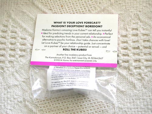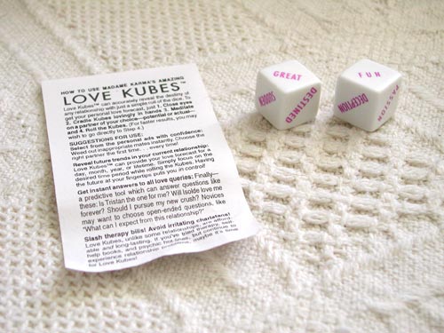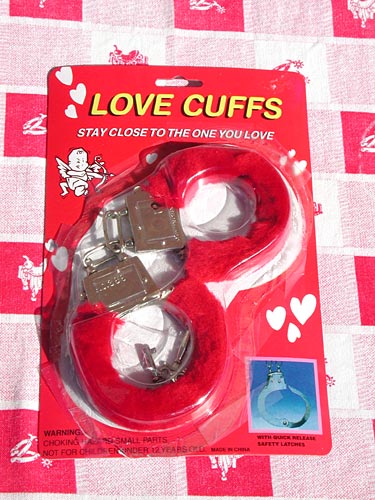 Love KubesI had no idea that relationships could be so easily figured out. Love Kubes promise that you can "Slash therapy bills! Avoid irritating charlatans!" when you use their prognosticatory properties. Just think about your lover, or a potential lover, and the cubes will tell you everything you need to know. Here are the simple instructions: "1. Close eyes. 2, Cradle Kubes lovingly in hands. 3. Meditate on a partner of your choice. 4. Roll the Kubes. For faster results, you may wish to go directly to Step 4." For faster results?!?! Like it takes such a long time to accomplish steps 1 through 3? If you can't go through all four steps like the instructions say, you aren't patient enough to be in a relationship. Give the opposite sex a break if you can't wait that long! I tried an alternative use for them. I closed my eyes and cradled the cubes lovingly in my hands. I thought, "What can my lover expect from ME?" I rolled the dice, and they came up with "NO BOREDOM." Damn, they're good. Love Cuffs"Stay close to the one you love." That's pretty much all you need to know about this product. Now, allow me to make two things perfectly clear: