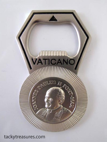 for "pope bottle opener." Carly Pope (http://en.wikipedia.org/wiki/Carly_Pope) has starred in movies such as Itty Bitty Titty Committee and Young People F**king. If you think she's not saintly enough to be a Pope, then you don't know enough about Catholic Church history. |