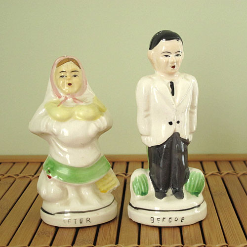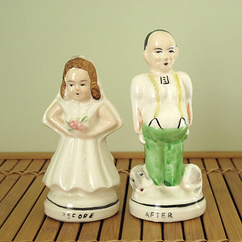 >> Back to Tacky Topics >> Salt and Pepper Shakers Before and After Wedding Salt and Pepper ShakersThis pair of salt and pepper shakers embodies a negative stereotype of older married couples. And yet, with a twist of the wrist, I was able to use them to demonstrate another negative stereotype entirely. These were a gift from Kaycee, who has an excellent eye for tacky treasures, and tackiness in general. The “Before” side of these shakers depict a bride and groom who are young and beautiful,with lovely clothes and fine figures. They seem unaware of the cruel fate that advancing age has in store for them. By turning the shakers around, we see what their creator wants to teach us about the realities of time. The “After” side of these shakers show a pair of old, paunchy, sloppily-dressed people. I realize this is supposed to make me laugh at the youthful optimism of a young, about-to-be-married couple, and poke fun at the aging process. But of course, to pull off a gag like this, one has to make some general assumptions about weddings and marriage. And as usual, I find myself not thinking it’s so funny because my life hasn’t always followed the mainstream path. For one thing, when my husband and I got married only a few years ago, let’s just say we were already a bit older than the age the “Before” scenario represents. However, my husband doesn’t have a trace of the paunch that the man in the “After” shakers has, and he’s got a lot more hair on his head, to boot. As for me, you’ll never see me in a babushka, and I haven’t worn a skirt or dress since before I retired last year. Of course, these shakers are tacky, and tackiness is never socially-conscious. But pointing out that older people can be beautiful, and can have rich love lives that are based on their inner qualities as well, just isn’t as funny as poking fun at stereotypes. As I was photographing these, I realized that there were more than just two ways to pose these salt and pepper shakers. You can also use them to portray May-December romances of both types; one where the husband is significantly older than the wife, and the other where the wife is significantly older than the husband. The feminist in me is required to note that when the wife is significantly older, she is labeled a “cougar,” whereas there is no corresponding derogatory term for a husband who is significantly older than his wife. This drove me to do some ten-minute research on the Internet where I found this article, which states the issues rather clearly: Don’t Call Me a Cougar – Rejecting the Cougar Stereotype. |