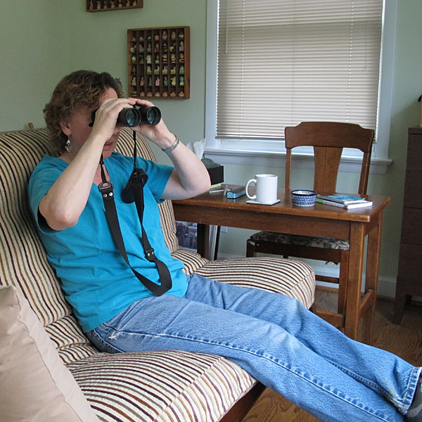 woodpecker Update 4/16/2006: I'm up to 30 species right now. I'm particularly happy to have an Eastern towhee. It's a beautiful bird about the size of a robin with bold patches of black, white, and rust. If you've ever been outside and heard a bird that sounds like it's saying "drink you tea," that's a towhee. Maybe that's why I'm so fond of that bird. We are all delighted to get advice that we are already willing to take, and tea is one of my favorite beverages (it's the other brown drink). I'll keep working on my couch list, even though I'll never be able to equal my sister's accomplishment. There's an escaped peacock that has been loose in her neighborhood for the past year, and he's often been seen in her yard. No one has been able to trap it, because apparently peacocks have a nasty temper. The Futon ListNovember 15, 2011 Now that I have a newly-renovated addition with big windows and a comfy futon, I am going to start keeping a futon list. Most birders keep a life list of all the bird species that they have ever seen. Not me…when I see a a bird that I’ve never seen before, I get excited. It’s one of the joys of birding. If I did keep a life list, and I were to see a bird that I thought was new to me, it would be a let-down to check my list and discover that it’s not. Not keeping a life list means I’ll have more exciting birding experiences, simply because my memory isn’t that great. Hey, I just discovered a silver lining to the aging process! The futon list may not have as many birds on it as the couch list did. The window out the living room faces approximately five wooded acres and a system of storm water management ponds, which attracts many water birds. The window out the addition on the back of my house faces the backyard, as well as several of my neighbors’ backyards. The futon list will probably not include ducks, geese, or herons, but who knows? Stranger things have happened. The great thing about these lists is that they remind me of how much wildlife there is in my neighborhood. It’s like counting my blessings! The Futon List (last updated December 10, 2013): blue jay