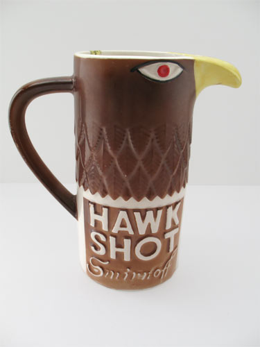 This is one more from the series "Mugs I Will Never Drink Out Of." What would you do if you were in Moscow in the coldest months of the year? (Cue up the music to "Dr. Zhivago".) This mug, possibly from the 1970s, may hold the answer. It is a promotional ceramic mug from Smirnoff, the Russian vodka brand that has been distilled in the United States since 1934. On the bottom of this mug is a recipe for a drink called the "Hawk Shot." All I can say is that it must get pretty cold in Russia. How I wish I had a camera to take a picture of your face when you read the ingredients of this mixed drink. Update: While suffering through a week-long nasty cold, I decided to find out if a Hawk Shot had any redeeming qualities, particularly in curing the common cold. I mean, there has to be some justification for this drink, don't you think? The day I felt the worst, I left work early, and on the way home I stopped at the liquor store in Union Station. Got myself a bottle of Stolichnaya vodka (much better than Smirnoff, IMHO) and another of Drambuie (in case the Hawk Shot didn't do the trick). When I got home, I mixed up the Hawk Shot, leaving out the twist of lemon, so I could try the drink with and without it. After the first sip, I realized that this was perhaps the worst drink I'd ever tasted...something like greasy vodka. To be fair, I tried a second sip with a lemon twist, and incredibly, the drink tasted even worse. It was then that I poured the entire drink down the kitchen drain. What a waste of good vodka! This experiment was performed as a public service to my readers. Do not try this drink, I'm warning you! Thank goodness I had the Drambuie. While it does not cure the common cold, it tastes a million times better than a Hawk Shot. |