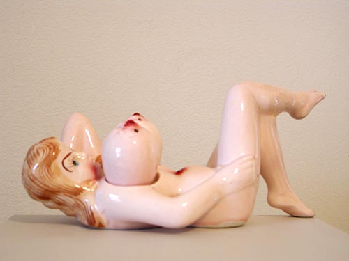 This could be one of the tackiest things I own. I still can't believe it is mine. I stare at wonder at the "perkiness" of these breasts, and am rendered speechless at the utter tastelessness of the entire object. That quality (or lack thereof) alone merits the designation of this object as a tacky treasure. Amazingly, this only took second place in the 2002 Tacky Treasures Road Show. Yes, only a banjo made from a bed pan could be more tasteless. |