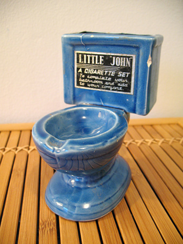 >> Back to Tacky Topics >> Ash Trays Toilet Ash TrayThis is actually the least objectionable of my "Ash Trays I'll Never Put My Smoke Out In." After all, you are supposed to put something disgusting in a toilet, so putting a cigarette out in one makes sense. The sign on the toilet tank reads "Little 'John' This toilet is gets a couple of points for not including the phrase, "Rest Your Ash," like so many other novelty toilet ash trays do. You can store cigarettes or matches in the toilet tank, and put out your cigarettes in the bowl. This appears to be from the 1930s or 1940s. |