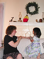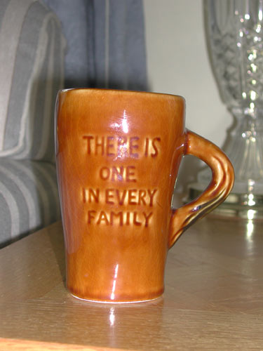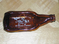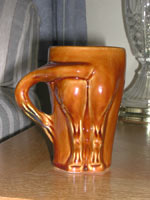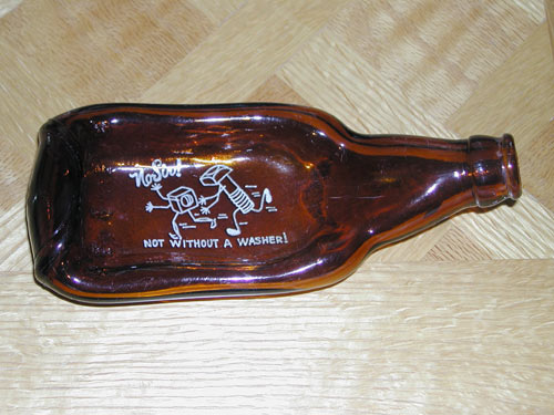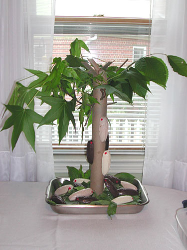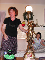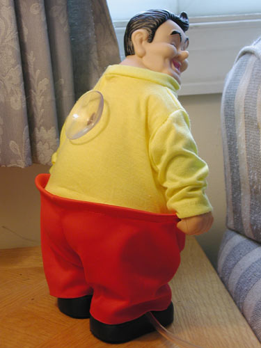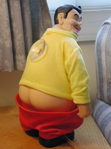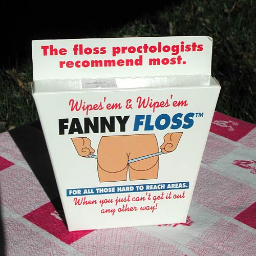 >> Back to Tacky Topics >> Tacky Treasures Road Show Tacky Treasures Road Show 2004The 2004 Tacky Treasures Road Show was held on the Sunday of the Memorial Day weekend. Partygoers were encouraged to bring in their tackiest things for appraisal and possible prizes. Five entries were singled out for presentation to the group, and prizes were awarded. Winning again in the category that she and Jumahl started in 2003 (Tacky Food Items) is Lynda Folwick for her cicada chocolates (Jumahl gets credit for building the tree). The Penis Pasta is her prize because one tacky food item deserves another. Assisting me as emcee was the irrepressible Miss Molly. At left, she looks on as I extol the artistically kitschy value of this fake bronze Schlitz lamp (brought in by Michele Macomber). At right, Molly demonstrates the "mooning man," the entry of my former roommate, Elizabeth Walkup. As you might guess, the suction cup is so that you can attach the man to the window of your car so you can moon other drivers. My former roommate, Elizabeth, gave me the following "mooning man," who has a suction cup on his back so he can be stuck to the interior of a car window. Using a bulb to force air through a tube, you can make his pants go down, and thus moon other drivers without risking an indecency charge. Isn't technology grand? See the Mooning Man in action! Of course, one good moon deserves another, so this is what Elizabeth got as her prize. Read more about this fabulous product, which promises to prevent "bum disease" through proper flossing. Pete Marshall is responsible for the horse's ass mug, which will definitely also have to appear in "Mugs I'll Never Drink Out Of." Pete wins a bottle opener with the Irish toast on it. The flattened-bottle ash tray was entered by Paul Tooley, who found it at Beckley's truck stop on Route 15 in Thurmont, Maryland. For his trouble Paul takes home the Milton & Bradley game, "Butt Ugly Martians," home for his kids. To quote Bill Schmidt: "Martians and hillbillies are the two ethnic groups that it's still okay to make fun of." And I think that's a truly tacky value to impart to one's children. |