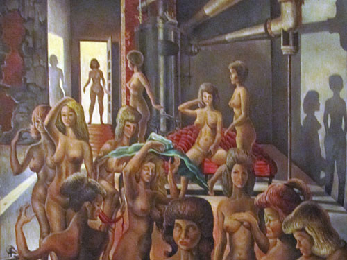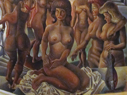 First Place: Naked Ladies Dulcimer Society paintingThis painting is the epitome of the expression, "so bad it's good." This huge oil painting is tacky in so many ways, that it's best just to gaze in wonder, and let all its kitschy qualities wash over you like a tsunami of tackiness. There's the thirteen well-endowed naked ladies, in various provocative poses in a boiler room that is inexplicably furnished with a red velvet couch. A naked blond in the lower right of the painting has one arm around her companion, and the other hand rests on a dulcimer. In the background, a naked woman stands in the doorway. Is she fearful of entering the boiler room, and if so, then why did she come naked? detail of upper half - detail of lower half The fact is, you could probably write a couple of short stories about what might be happening in this painting, but who knows if you'd be right? We don't know who the artist is because much of the bottom edge of the painting is damaged. Jeff says he found it in an antique store in Southern Maryland, where