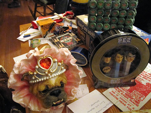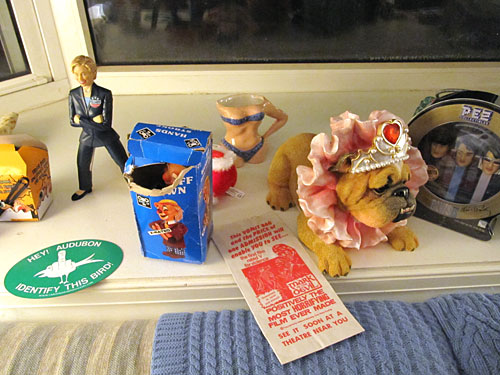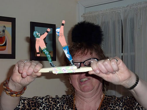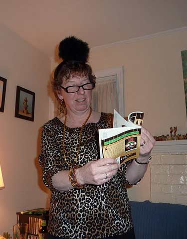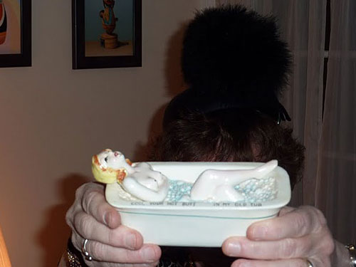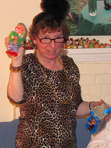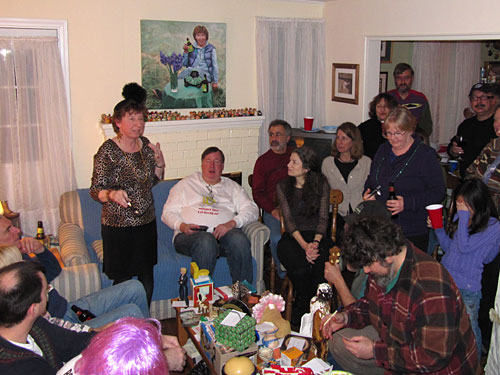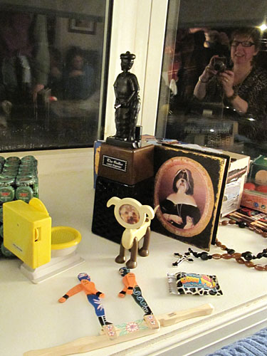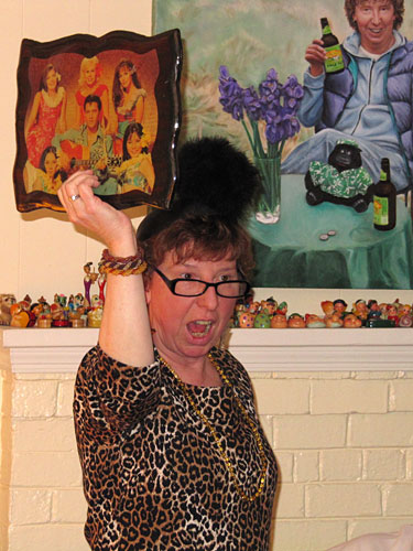 >> Back to Tacky Topics >> Tacky Treasures Road Show Tacky Treasures Road Show 2011Intro - Winners - Prizes - Also Rans - Acknowledgments This year's Tacky Treasures Road Show was remarkable for a number of reasons. It was the largest audience I remember; about 50 people came to the house, and almost all them watched the show (the rest played old-time music in the basement). I may have to rent a hall for the next road show. It was the first show at which someone had the audacity to enter an item that I had given them as a Christmas present. I would have been more outraged if I hadn't been toying around with putting one of Bob's gifts to me in the show. Lucky for me (and Bob), I found two other entries that I liked better. This was the year that someone entered the largest tacky treasure ever. The contestant could barely get it into his mini-van. And it was tacky. Boy was it tacky. Of course it took first prize, and it will be remembered forever in the annals of tackiness. So, without further ado, here are the winners of the 2011 Tacky Treasures Road Show: The Winners