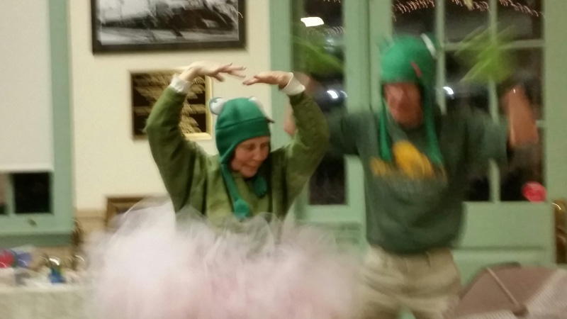 First Place: The Frogs of WindhamThe Frogs of Windham is an 1891 operetta that is tacky on so many levels, I immediately recognized it as a tacky treasure. Here are just three of the ways this work was tacky: First, the operetta concerns a tacky story from Connecticut's colonial past, about a town that was frightened by strange sounds in the nightime. Some of the men shot their muskets to scare off what were thought to be native Americans who were about to attack the town (this happened in 1754, during the French and Indian War). Others thought that the noises were a harbinger of impending doom and fell to their knees, praying and wailing. The next morning, after the noises had subsided and the sun had come up, some intrepid citizens headed to the edge of town to investigate, only to find that it had just been a battle of frogs at a local pond. From that day forward, the citizens of Windham were the butt of jokes about the incident. However, as the years went on, they came to embrace the story as a proud symbol of their town, as evidenced by this 1891 operetta. It was last performed in 1983, in what was described as "a director's nightmare," in an article in the New York Times. Even as recently as 2000, a bridge in Windham, which crosses the Willimantic River, was adorned with four eleven-foot sculptures of frogs, sitting atop spools (Windham is also known as "Thread City," once being the home of the American Thread Company). The second thing I find tacky about it is how Burton E. Leavitt (a student at Yale) and his father, Nason W. Leavitt (a vaudeville performer and newspaper publisher) found this tacky story worthy of operatic treatment. I can't speak to the quality of music (there are no known recordings of the entire operetta, go figure), but the plot is formulaic and unimaginative (the frog story wasn't enough, so a romantic subplot of a predictable nature was also added). However, it is the libretto -- the words of the operetta -- which is truly tacky. It's not just the labored rhyming: ALL: Was that all? Capt -- well that's enough Col. Dyer: It's also that the text is rife with horrific stereotyping of various ethnic groups. For the road show, I cleaned up much of the characterizations and the dialect, as much to make it easier to perform as it was to be more politically correct. The third tacky thing about this operetta is the way it was performed for the road show. With absolutely no experience directing an opera, I solicited a group of friends to put on a 10-minute portion of the work for the Tacky Treasures Road Show audience. With only one rehearsal, the actors, singers, and musicians put on a pretty good show, which got a lot of laughs, some unintentional. Hey, we knew it was tacky before we staged it. A highlight of the show was the frog ballet, performed by Bob Cantor and Carolee Rand.