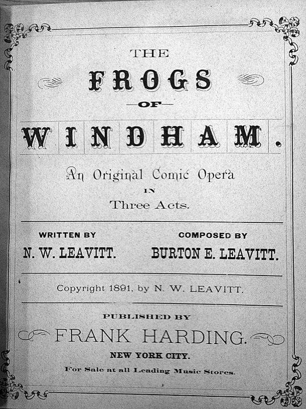 Some may think that it is tacky that I won first place in my own contest, but it isn't the first time. In this case, however, I can't claim all the glory. Here's a list of those who helped put on The Frogs of Windham. Thank you, everyone! Actors: Abbie Grotke, Liz Madden, Neil Orlando, Julie Mangin (servants); Carolee Rand and Bob Cantor (frogs); Jeff Chumley (Col. Dyer); Susan Chumley (Capt. Follett); Linda Julien (Parson White); Liz Roll and Fred Julien (soldiers); Musicians (a.k.a., the Tacky Treasures Orchestra): Neil Gladd on mandolin, Denis Malloy on bass clarinet. Singers: (a.k.a., the Tacky Treasures Chorus): Betsy Fulford, soprano; Greg Scholtz, baritone.