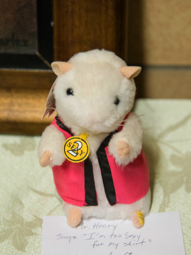 >> Back to Tacky Topics >> Tacky Treasures Road Show Tacky Treasures Road Show 2015Intro - Winners - Prizes - Also Rans The Tacky Treasures Road Show is modeled after the PBS program "Antiques Roadshow," except that in this case the question the appraiser always asks is, "Do you have any idea how tacky this is?" I love the sound of that, so I do it every year. This year's road show took place on March 28, 2015 at the Silver Spring B&O Train Station. No longer used as a railroad station, it has been restored (by Montgomery Preservation, Inc.) to look as it did in 1945, complete with ticket booth, lockers, phone booth, and a waiting room with comfy benches. There were 27 entries, a few more than last year. This was the first year that a performance was entered into the competition. More on that later, but let's just say that it almost turned the event into the Tacky Treasures TOAD Show. A big thanks goes to this year's judges, who were: Denis Malloy and Mark Lynch. While they made their deliberations, I displayed the five prizes. I was so glad that I was able to get rid of -- I mean find some things in my collection worthy of serving as prizes in the road show. This show would be nothing if not for the enthusiastic participants who enter the competition. There was stiff competition for the five prizes, and as far as I'm concerned, anyone who didn't win can rightfully say, "I came in sixth." I also want to thank, and give due credit, to everyone who sent me photographs for this report. I would also like to thank all those who contributed to the donation bucket. I recovered more than half of what I spent to rent the station, which is a big help. Again, THANK YOU! Key to the photographers' codes on the photos: BC = Bob Cantor; EB = eBay; EW = Ellen Walsh; JM = Julie Mangin; LR = Liz Roll; MS = Mark Sachs; NG = Neil Gladd. The Winners