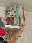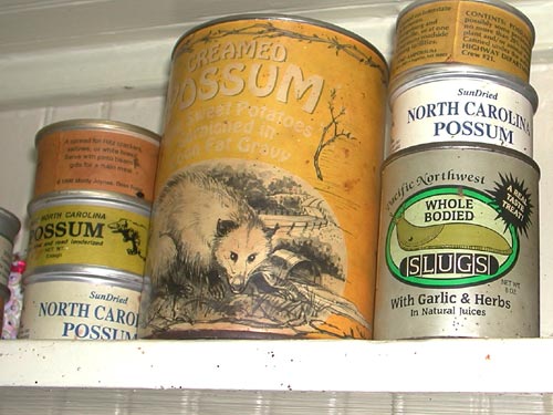 At that last statement, they both nodded. Back on the road, armed with their description, I found Planet Wayside. This tacky little shed was just as they described. The proprietor was equally eccentric. As I walked in, I was greeted, no, let's just say my presence was acknowledged, by a large man with gray hair wearing a tee shirt that read, "What if the Hokey Pokey really is what it's all about?" After giving me a slight nod, he walked away and I asked, "Is it okay if I seat myself?" He replied over his shoulder, "Sure, no one else is going to." I sat at the counter, and looked around. Mr. Hokey Pokey (owner Tim O'Neil) came over and handed me a menu. There were also specials on the board: mushroom and spinach quiche, and something called "Whiskers on Kittens soup." I heard another customer ask what that meant, to which Tim deadpanned, "You know those things on the faces of cats," or something to that effect. The customer didn't ask him to elaborate, and no one ordered it while I was present. I ordered the pork barbecue sandwich with cole slaw and an IPA. My food arrived shortly thereafter: hot, good and freshly made. I heard that there is a smoker behind the restaurant because Tim disappeared periodically to tend it. While eating and listening to "I Could Have Danced All Night" on the stereo system, I checked out the decor, and found it most satisfactorily tacky, from the box of Spotted Owl Helper on the shelf to the series of prints of dogs playing poker. The counter listed a couple of degrees at one end, but not on the other. That is to say, its top could not be said to occupy a single plane. How they kept things from rolling off it all the time is a mystery to me. Despite the feeling I got that the whole place was ready to tumble down, it had a cozy, natural feel. Planet Wayside is tacky, but it isn't trying to be tacky. It comes by it honestly, something that ranks high in my criteria for a tacky treasure. The most entertaining decorative element of the place was a cariacature of Madeline Albright on one wall, and on the opposite was a letter from her to the owner. He'd written an article in the Loudoun Times-Mirror about the time she showed up at the Planet Wayside, with a full entourage of Secret Service agents, just because she was in the mood for some barbecue. Shortly after she left the restaurant, Tim noticed she'd left her purse behind. He ran out to catch her before her car left, shouting behind the moving car, with a purse swinging in his hand. The car screeched to a halt, and two agents jumped out with weapons drawn. "Don't shoot! It's not my purse!" he cried. The letter from Albright apologizes for the mishap and promised next time not to be so disruptive or forgetful. Tim was assisted by his wife Suzanne, who shared his quirky sense of humor. Every question I asked was treated as if it came from an idiot. For example, I said to Suzanne, "Can I ask you about the tee shirts?" as I pointed to the two on display. Her response: "Well, you're looking at them." Eventually, we came around to the truth of the matter, and that was that they did have a tee shirt in my size, and in the color I desired. On the back it read, "I got my brain transplant at Planet Wayside." By that time, the stereo was playing "Hotel California." My food and the shirt were rung up on a 1912 NCR cash register which Tim pointed out works all the time, even during a power failure. The last time I visited Planet Wayside was on the first day that it reopened after Suzanne's death. Tim still seemed deeply sad about her death, but happy to see all of his regular customers, who came to welcome him back. And they were glad to see him, too. The restaurant hadn't been open an hour before the local fire department called to order a half a dozen sandwiches. Update: 2006 -- Tim has reportedly quit the restaurant to work on his Vietnam memoirs, and has turned the running of the restaurant over to his son, Morgan. Despite the fire that destroyed their house, Tim and Morgan managed to save the box of 3x5 cards containing all of Suzanne's recipes. Whiskers on Kittens soup lives on! Update: 2007 -- Planet Wayside is gone; replaced by Lowry's Crab Shack. Read More About It: