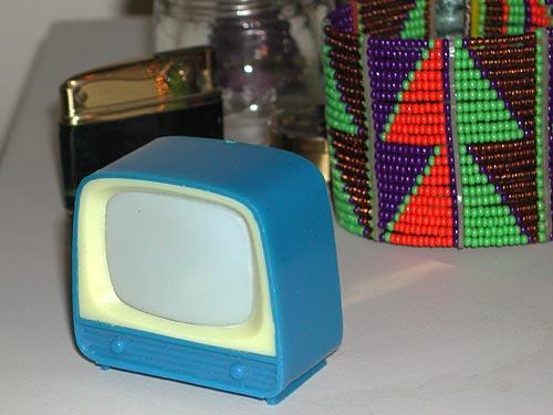 It's hard to imagine who thought this was an appropriate way to present the work of some of the finest painters of the last couple of centuries. Here we have a 1 x 2 by 1 3/4 inch plastic television with a viewfinder on the back and eight slides of major works of art inside. From Gauguin to Monet, Van Gogh to Lautrec, one can only view these works by squinting through a 1/4 inch opening with a magnifier. "Starry Night" loses something with this rendering, as does one of Monet's winter haystack series, which must be renamed "Muffins with Anthrax," if one went by their appearance here. Truly a naïve attempt at sophistication, and as such, a tacky treasure. |