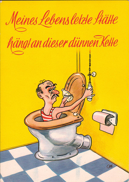 I wish I’d had this postcard for last year’s Toilet Week. It would have added an international flair to the event. It depicts a man with a bottle of schnapps in his hand about to flush himself down a toilet. The caption reads, “My life’s last station hangs on this chain.” Wow, that is certainly more clever than what we Americans usually come up with: “Goodbye cruel world!” This reminds me that my first encounter with the concept of tackiness involved postcards. Way back when I was in college, one of my friends conducted a tacky postcard contest. People sent her the tackiest ones that they could find, and after a while, she would declare a winner. The first year I remember this contest happening, the winner was the picture of a dead cowboy in the desert with a vulture on his back, with the caption, “The End of the Road.” Ah, memories! I found the tacky German postcard at the Mount Vernon Antique Center while on a tacky quest. The Tacky Treasures Road Show is coming up soon, and I hoped that day for a big find. And in fact, I did find something fabulously tacky, but unfortunately it was way out of my price range. It was a stuffed macaque monkey in its own glass display case, holding a small ceramic pitcher and a red wine glass. The sticker price was an unbelievable $3,500.00. Even when the sales person said helpfully, “It’s 30% off today,” there was no way that I could afford it. On the other hand, at that price, I don’t think it’s going anywhere soon, and I might just head back to Mt. Vernon one of these days to visit it. Unfortunately, I do not have a photo of the monkey worth posting. My cellphone camera is horrible, and most antique malls actually forbid the use of cameras. The only reason I took a shot of the monkey with my phone was in case someone doubted my story and I needed proof. Back to the tacky German postcard…it’s now on display in my downstairs bathroom with rest of my toilet and outhouse collection. Thanks to John Heins for the translation of the caption of the postcard. |
