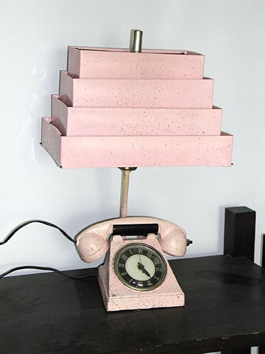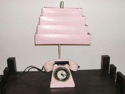 This combination lamp/clock/cigarette lighter is multi-tasking its little heart out. From the Venetian blind shade down to the working cigarette lighter in the receiver, all its features still work (and I've got a burn in my palm to prove it). The only thing it doesn't do is function as a telephone. This wonderful lamp is the antithesis of the major tenet of Bauhaus design: form follows function. This one's got great form, but its function ran off into three different directions. |