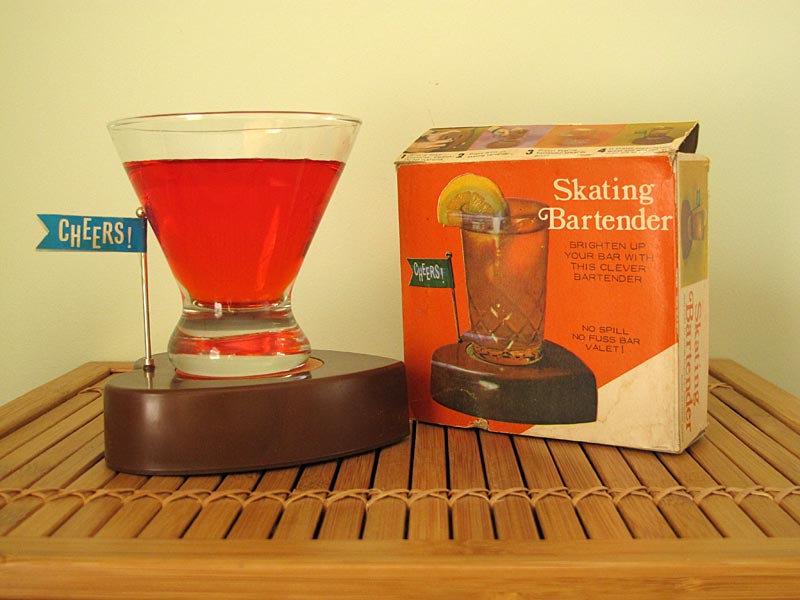 "Brighten up your bar with this clever bartender." It' a "no spill no fuss bar valet!" Pretty sweeping claims for a rickety little plastic coaster on wheels, but that' the nature of marketing in the world of cheap-ass novelty items. The instructions tell you to wind it up, put your drink on the skating bartender, and point it toward your guests. Let the fun begin! Or, as the packaging suggests, "add fun to your guests’ drinking." I know that they guarantee that skating bartender won’t go over the edge, but I ask you, is it worth the risk? I won’t take chances like that with my alcohol, and I won’t with my guests’ either! The little flag saying "Cheers!" is a nice touch, however. It even has "Lachaim" on the reverse side. I don’t know if this is a proper transliteration of the Yiddish expression meaning "to life," but I feel compelled to refer those who care to the Library of Congress. This is another one of those products that promise to change a dull party into a laugh riot. (Remember Stop-Ice, Mermaid Picks, and Naughty Dog?) If that' all that it takes to improve a party, then there most be a lot of really dull parties going on. Or maybe this product is another one that needs to be referred to the Department of Overstated Claims. Cheers! |