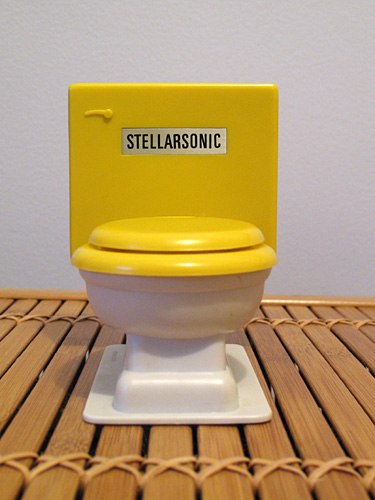 This toilet radio came in the mail -- a purchase from eBay made when I was cooped up in our house during the blizzard of February 2010. It is only 4 inches tall, made of yellow and white plastic, with the word "Stellarsonic" labeled on the the tank. The speaker is located in the bowl, under the plastic lid. It made me wonder what might be the most appropriate sound to come out of it. Once I put a 9-volt battery in it, it pulled a strong signal from nearby WTOP. Since I got it during the Winter Olympics in Vancouver, the announcer was saying, "Danger! Danger, Will Robinson! You are about to hear Olympic results before they are televised." It made me laugh to hear a 1960s science fiction TV program reference on a radio that was made about the same time. I fiddled with the radio tuner on the left side of the tank, and sent it all the way to the other end of the frequency range. A woman shrieked something about C-SPAN turning off their cameras whenever she entered a room. The host thanked her, saying "...that was Ann Coulter, and I'm Sean Hannity." I thought that the toilet had found its own level, and I turned it off before hearing any more. I haven't had a battery radio in so long, and I wasn't sure what I would have done during the blizzard if we had lost power. Next time, I know I'll have my plastic toilet radio to rely upon, although I'll probably turn the dial back in the direction of WTOP -- away from political rhetoric, which has never done me much good during an emergency. |