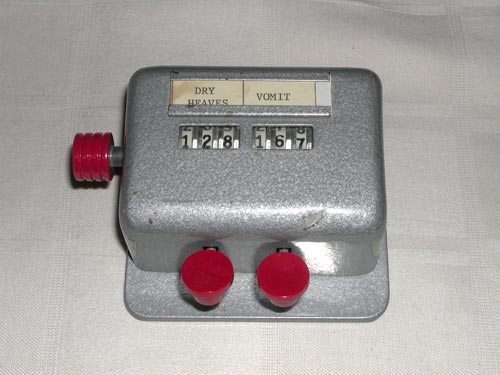 ![]() Vomitometer Here's a fascinating piece of scientific instrumentation: the vomitometer. I did a cursory search of Google for the word, and only found instances of people using "vomitometer" in a metaphorical sense. Who know there really was such a thing? John Schwab, that's who. He discovered it in the surplus equipment room of a government agency that shall remain unnamed. Enlarge the picture by clicking on it, and try not to gag. |